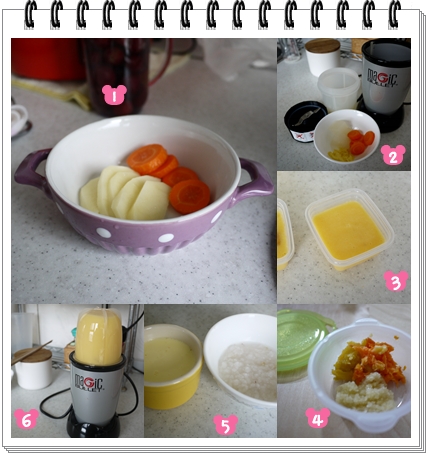 小兔子四個月時保姆就迫不及待開始餵他副食品了.牛奶裡加了米精. 每天也有下午茶點心時光試吃各種水果泥.己經嚐過的有蘋果,葡萄,芭樂,柳丁,桃子,梨子,香蕉,木瓜.不是打成果汁就是磨成泥.據保姆說,香蕉是他的最愛. 剛開始要稀釋,加了水後的蘋果泥稀稀的加上還不會吞嚥這個動作, 餵很久才吃完大人一口份量的水果泥而且附上邊吃邊流滿嘴的恐怖吃相.