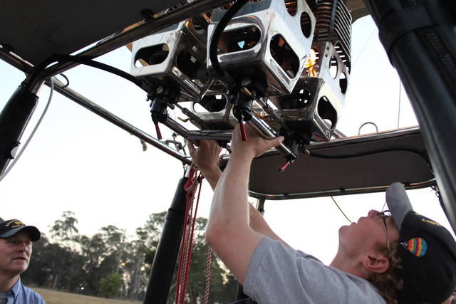 熱汽球起飛前置作業 完成後,大家跳進籃子裡,揮揮手,準備起飛嘍!