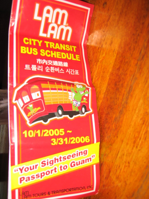 第三天決定租車去南部觀光, 這是第一次在國外自己租車, 所以其實有點擔心會撞壞車, 或是遇到不老實的租車行來坑觀光客, 還好都沒發生, 算是成功的第一次嚐試. 車行是導遊直接帶我們去的, “逹樂租車 (Dollars)”因為是台灣人開的 (在很多介紹關島的網站好像都有看到廣告), 有中/英/日語服務, 車行還送一張關島地圖(註一). 在關島用台灣駕照也可以租車, 不過, 謹慎為上, 還是先換了一張國際駕照, 要是真出了什麼事,至少不會給租車公司這個不是國際駕照的藉口. 租了一台Toyata 的車24hr, US$48, 第三責任險$15, 其它的就看個人的選擇是否要買好一點的保險. 關島的馬路是珊瑚礁鋪成的, 下雨後很容易打滑要特別注意, 除了這一點, 大致上都還一樣, 路滿大條的又直又平其實是滿好開的.
