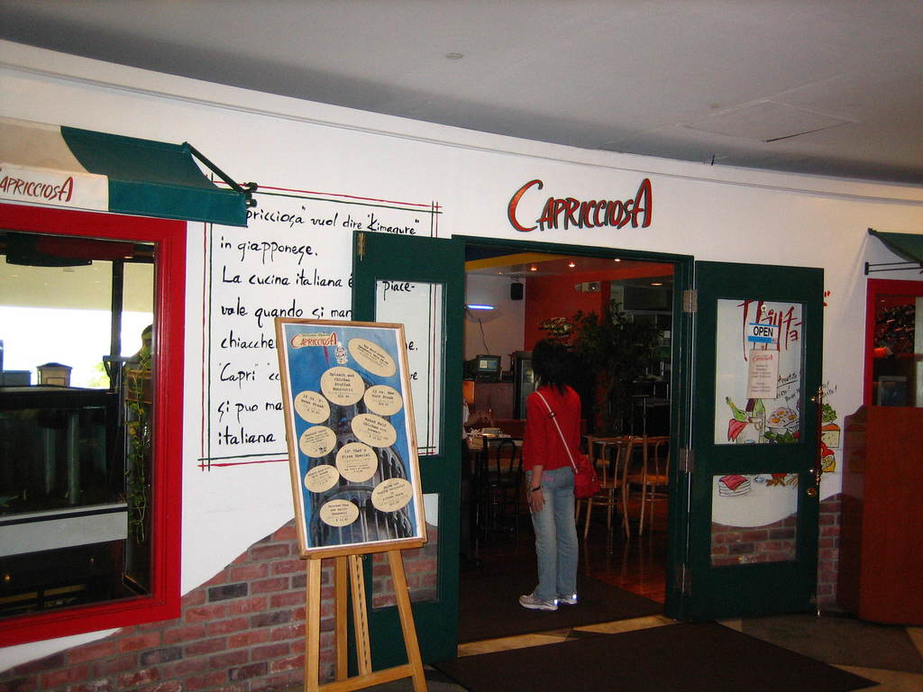 這家叫Capricciosa的意大利餐廳在皇蘭飯店(PIC對面的另一家飯店) 2樓,小小的一家店,有種義式廚房的溫馨感. 它的招牌是墨魚麵和Pizza,可惜我們不吃墨魚麵, 就請waiter幫我們介紹其它的超人氣餐點. Menu上有英文/日語沒有圖片 (有圖片的那張看起來實在很糟,沒有拍攝出食物的美味可口的感覺), 不過還好它的食物真的很好吃啦! 我們點了熱騰騰而酥脆的烤麵包, 料多湯濃的蛤蜊巧達湯 (可惜蛤蜊太老很韌), 主廚蕃茄海鮮麵, 及現烤的11吋脆薄皮海鮮pizza, 份量都很大, 三個人分吃這四道菜就吃的很飽了, 心滿意足的走出這家餐廳, 實在太飽了決定散步回去希爾頓.